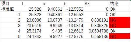 测试结论“NG”表示计算的ΔE值大于设定的ΔE参考值